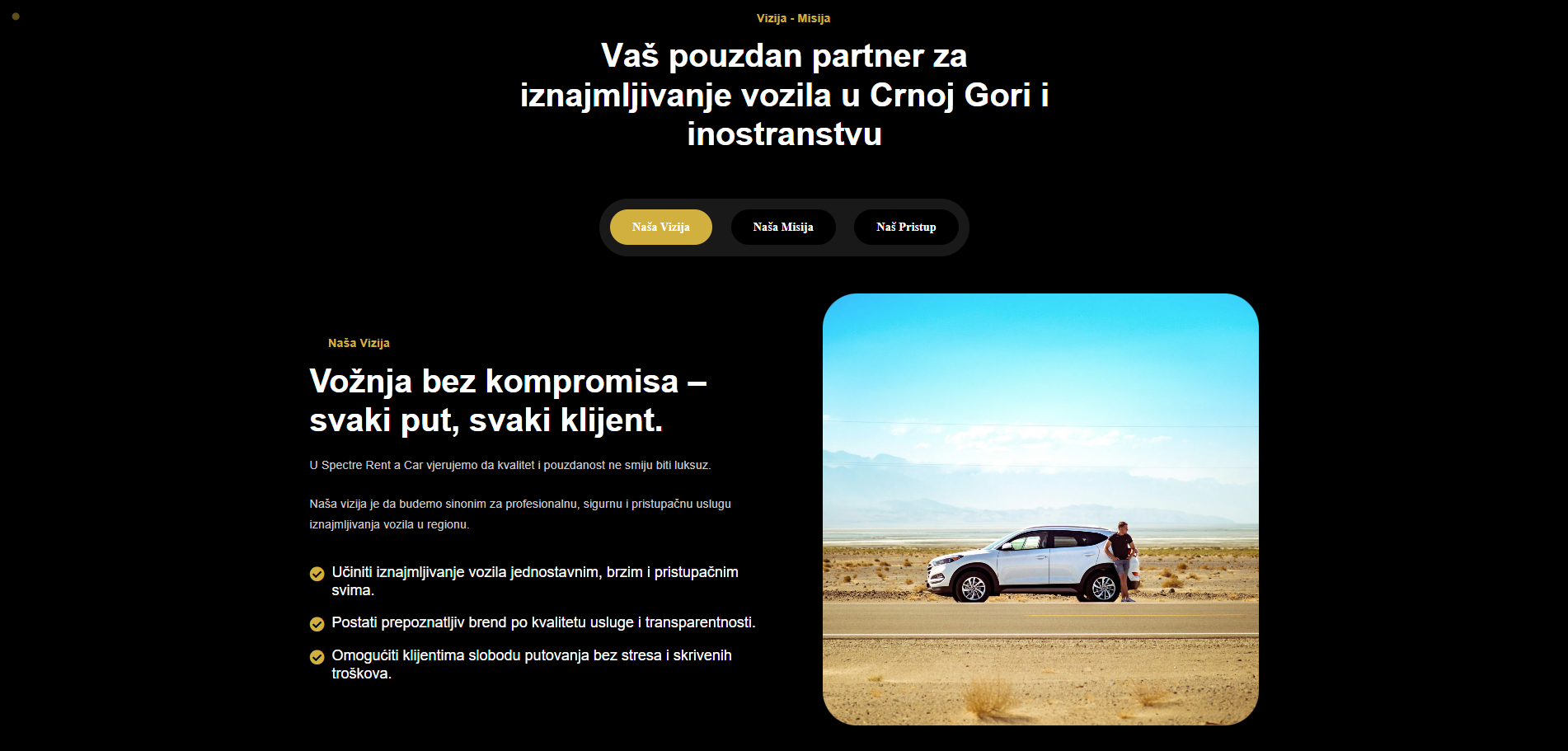 Spectre Rentals je moderna rent-a-car web platforma koja omogućava korisnicima da online rezervišu vozila u realnom vremenu. Klijenti mogu pregledati dostupna vozila, filtrirati po tipu, cijeni i lokaciji, a administratori imaju detaljan backend za upravljanje flotom, cijenama i terminima.