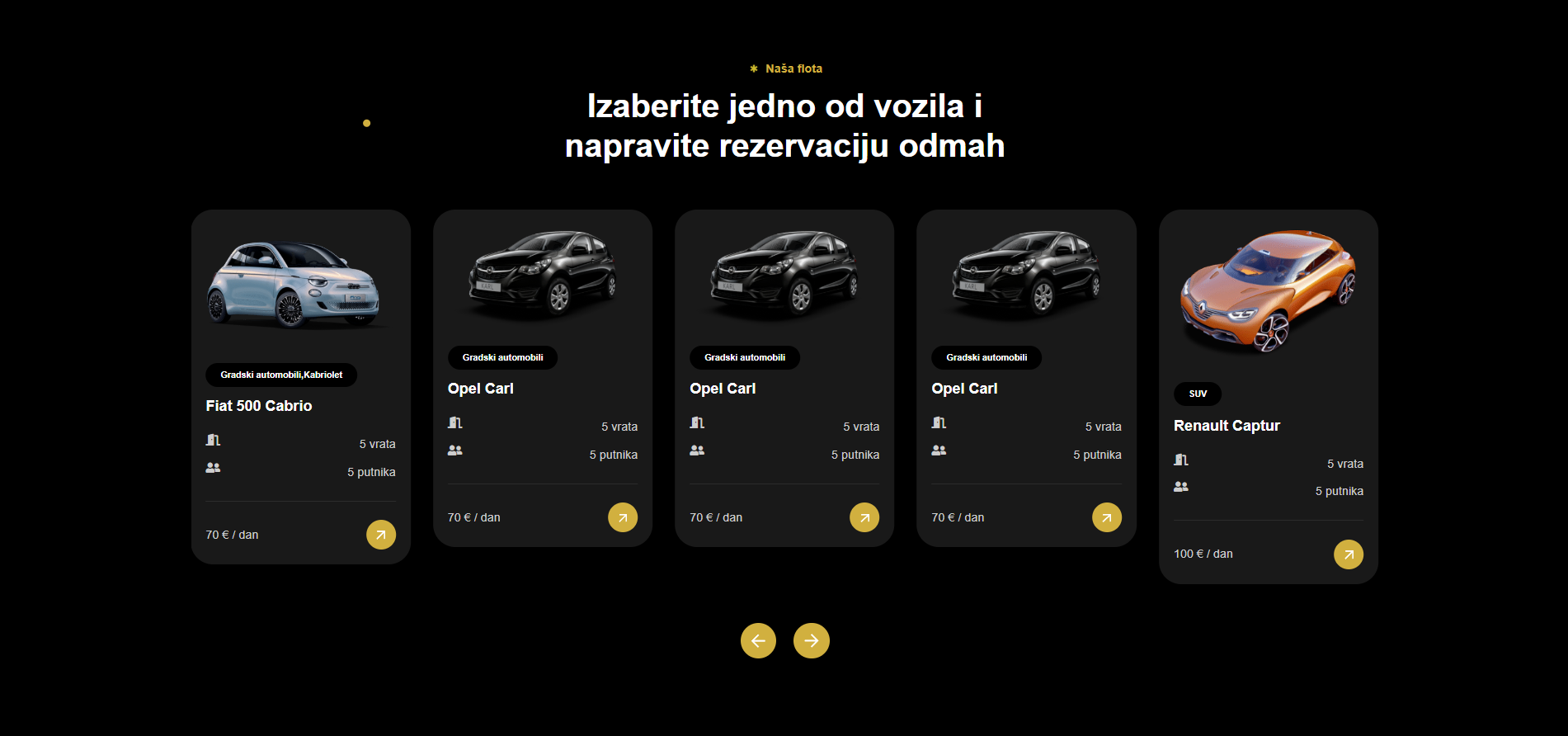 Korišćen Next.js i Tailwind za frontend, Node.js backend, MongoDB baza podataka. Implementiran booking engine, kalkulacija cijena po danima, dodatne opcije (osiguranje, dodatna oprema), i automatska potvrda rezervacija. Email notifikacije i SMS podsjetnici za korisnike.