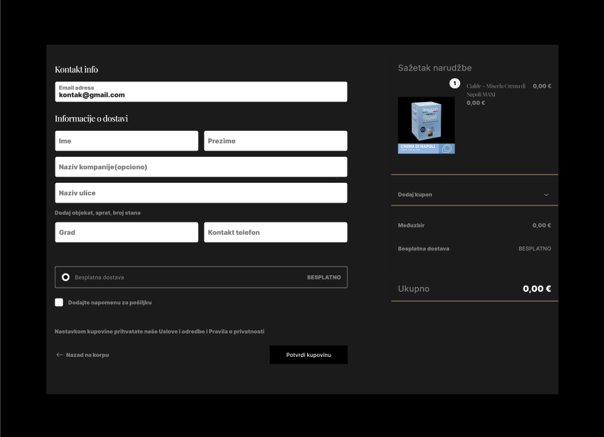 Definisana struktura kataloga proizvoda, kategorija i varijacija, kreirani korisnički tokovi za kupovinu sa ciljem minimizacije broja koraka u checkout procesu. Planirana baza podataka za artikle, cene, promocije i narudžbine.
