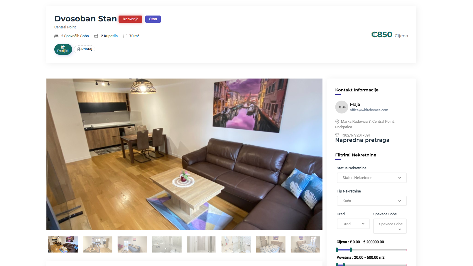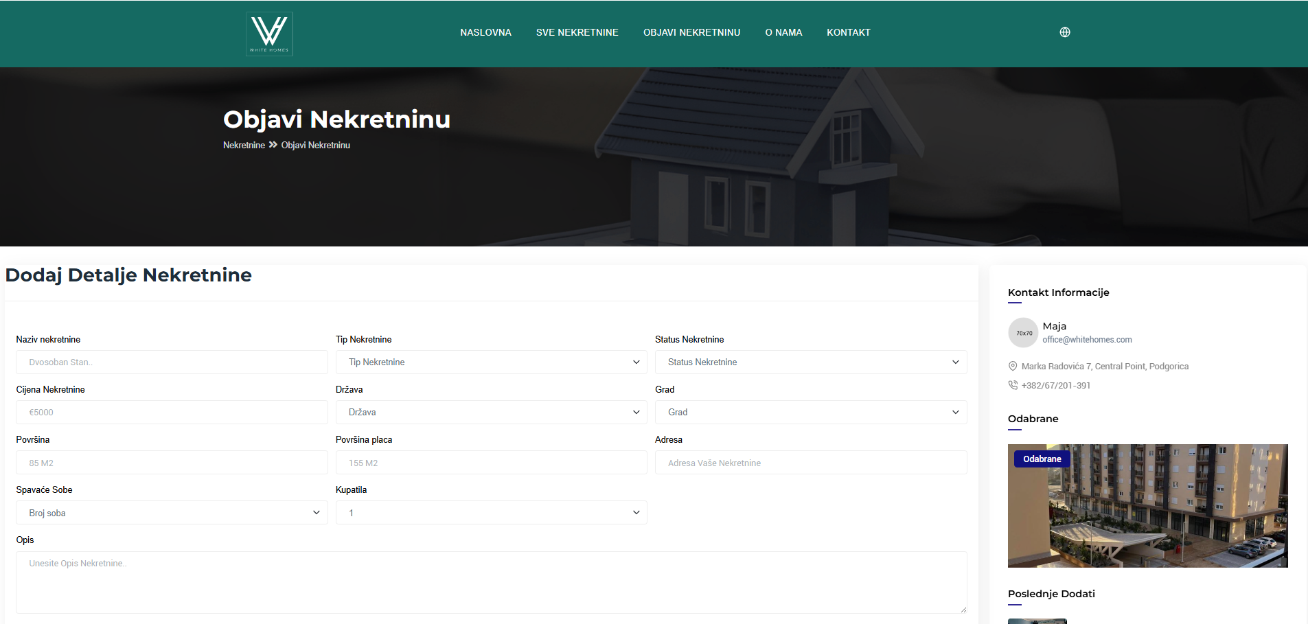 White Homes je savremena web platforma za oglašavanje i pretragu nekretnina. Korisnici mogu kreirati naloge, dodavati svoje nekretnine, koristiti detaljne filtere i pratiti statistiku putem ličnog panela (dashboard-a). Platforma je fokusirana na jednostavno korisničko iskustvo i omogućava brzo i efikasno pronalaženje stanova, kuća i poslovnih prostora.