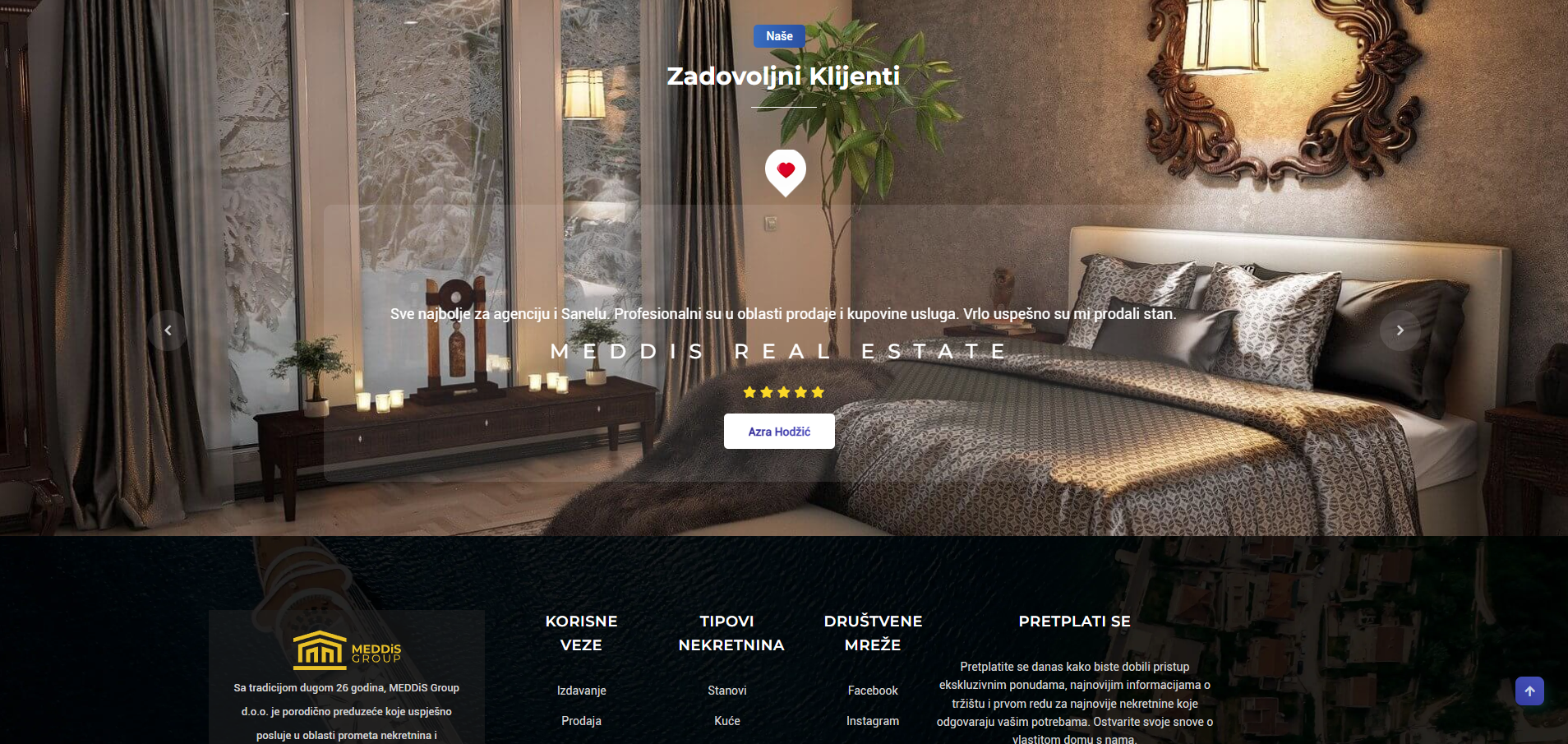 Meddis Nekretnine je savremena platforma za prezentaciju i pretragu nekretnina. Omogućava korisnicima da brzo pronađu stanove, kuće i poslovne prostore prema lokaciji, cijeni i drugim filterima, dok administracija ima jednostavan CMS za upravljanje ponudama.