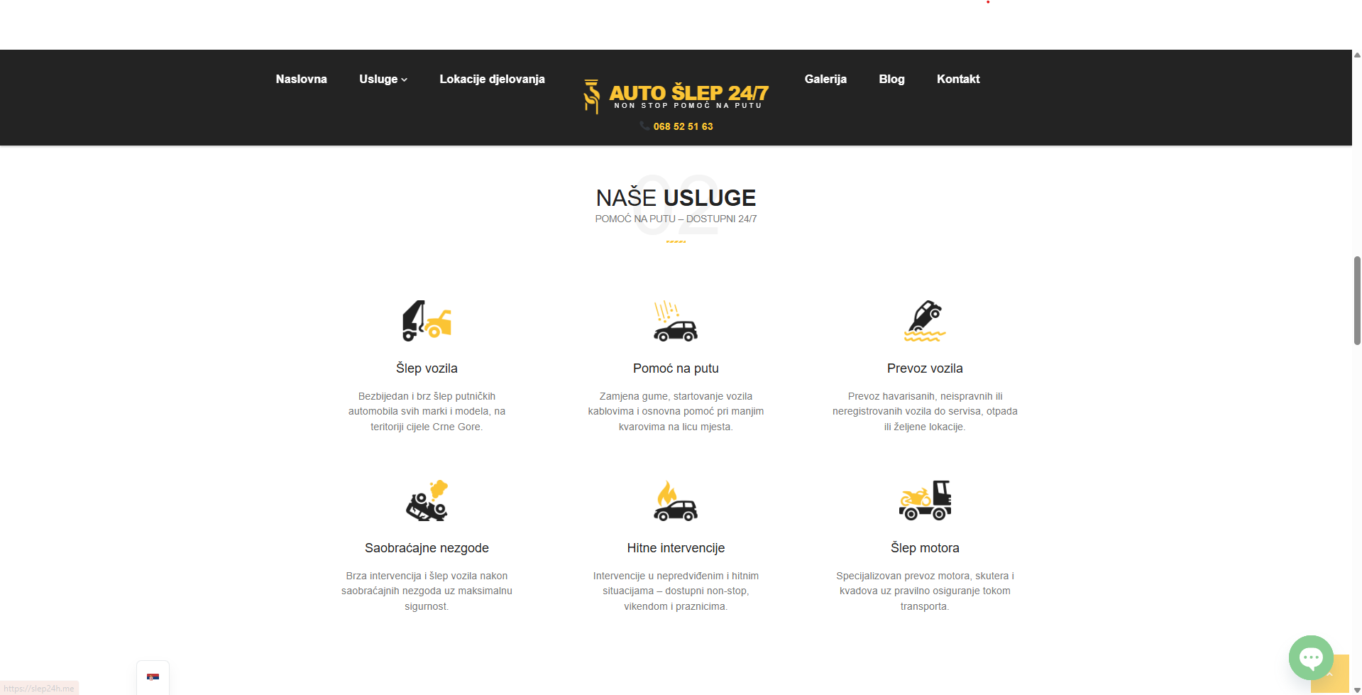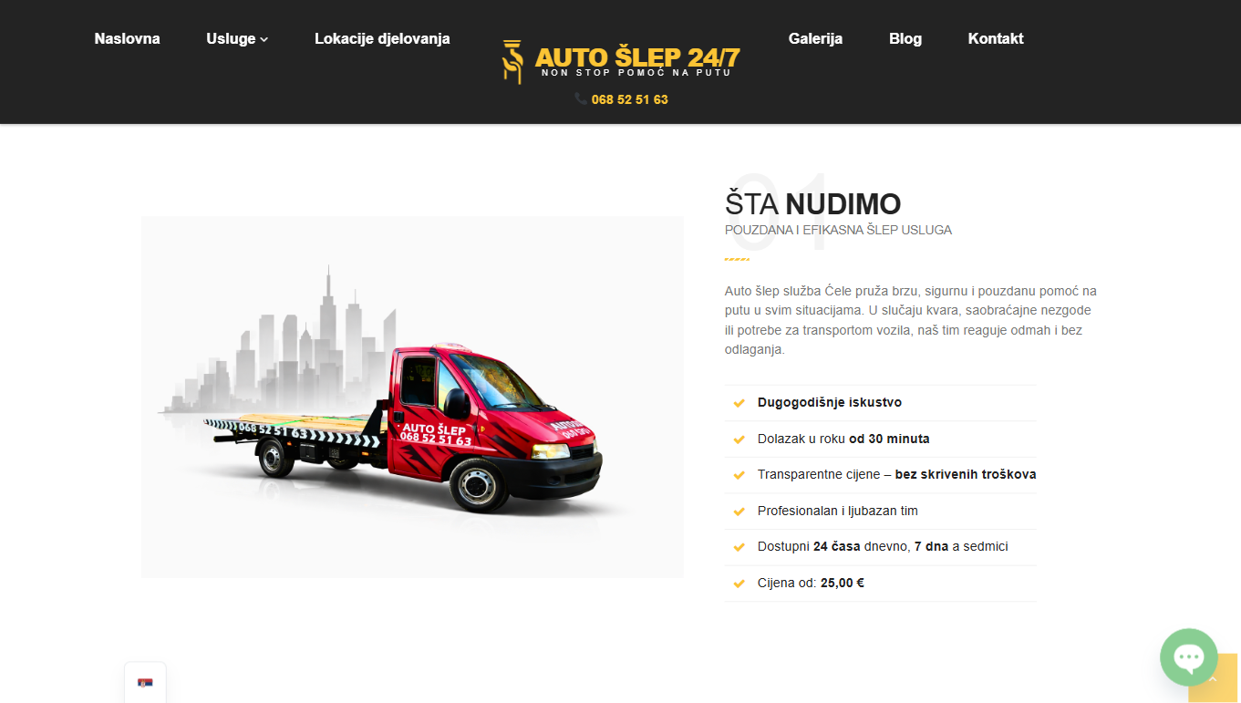 Auto Šlep Ćele 24/7 je servisna web platforma za hitnu pomoć na putu, sa fokusom na brzo generisanje lead-ova, lokalni SEO i direktan kontakt putem poziva i formulara. Korisnici mogu jednostavno zatražiti šlep, prijaviti lokaciju i dobiti procjenu u najkraćem roku.