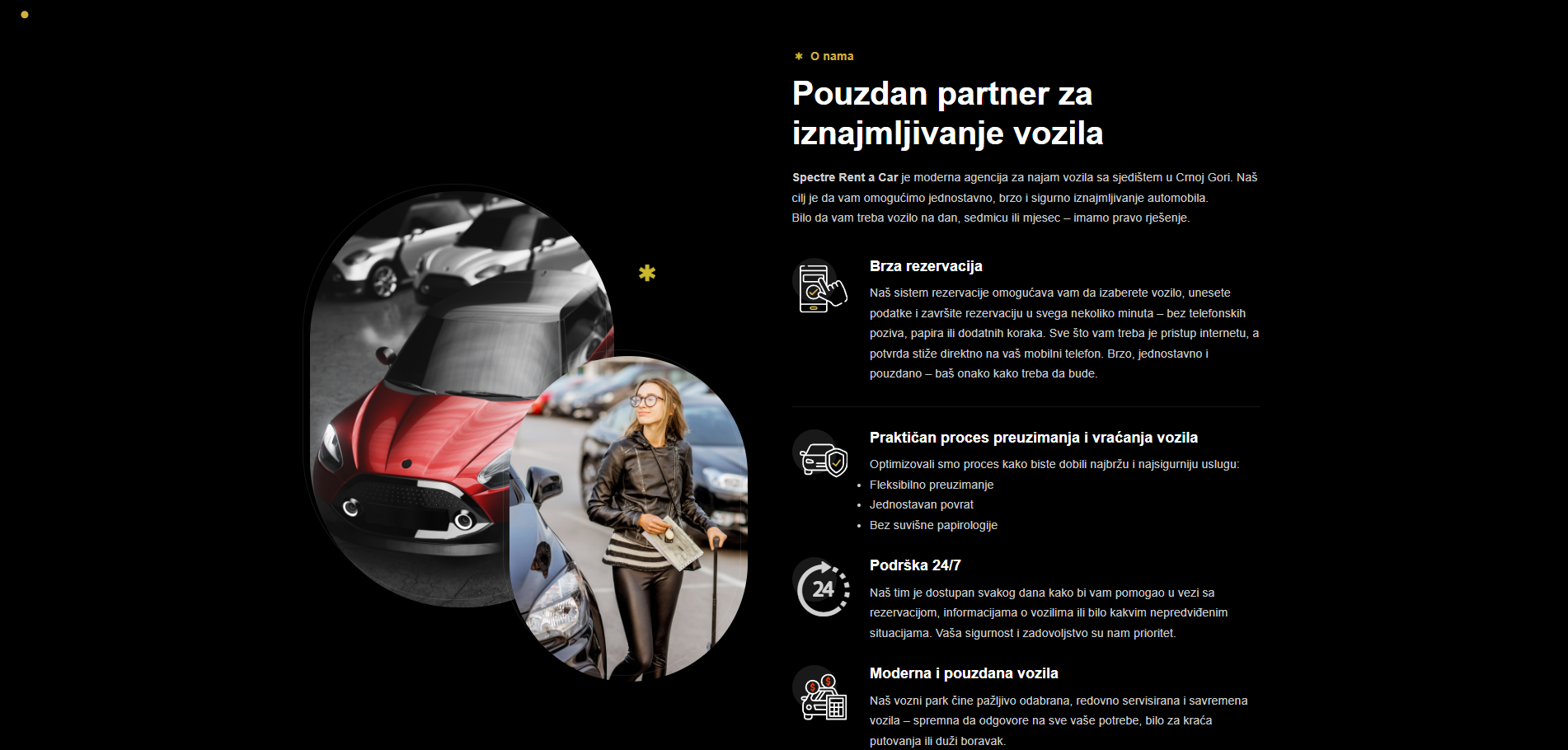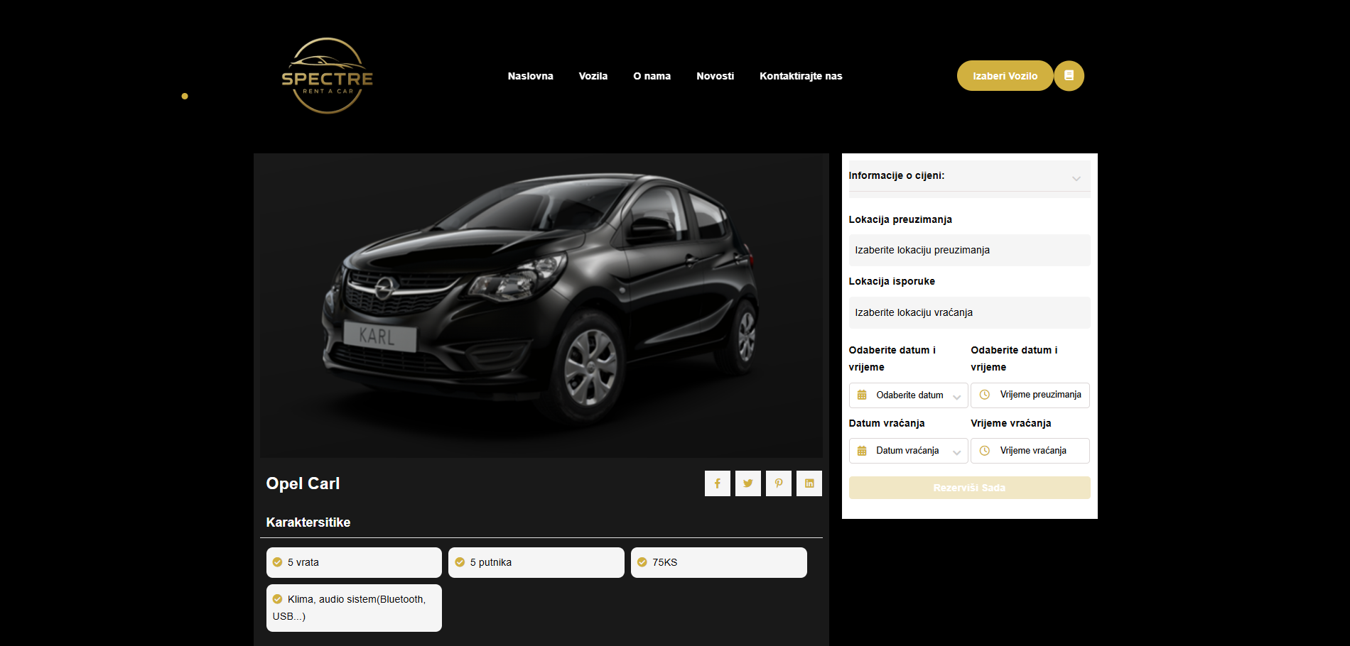 Spectre Rentals je moderna rent-a-car web platforma koja omogućava korisnicima da online rezervišu vozila u realnom vremenu. Klijenti mogu pregledati dostupna vozila, filtrirati po tipu, cijeni i lokaciji, a administratori imaju detaljan backend za upravljanje flotom, cijenama i terminima.
